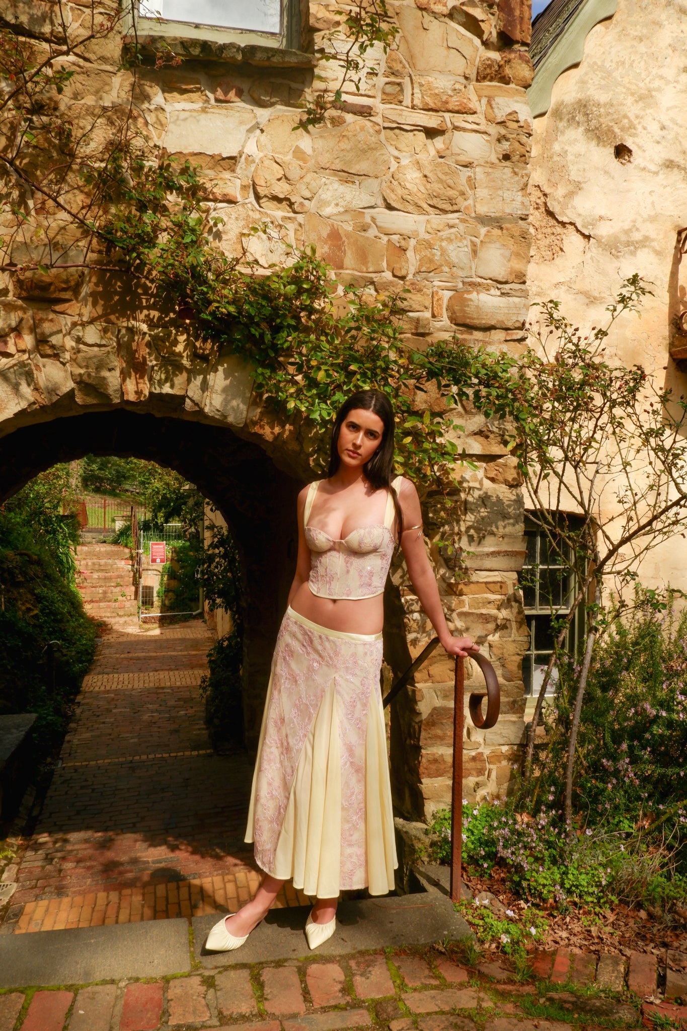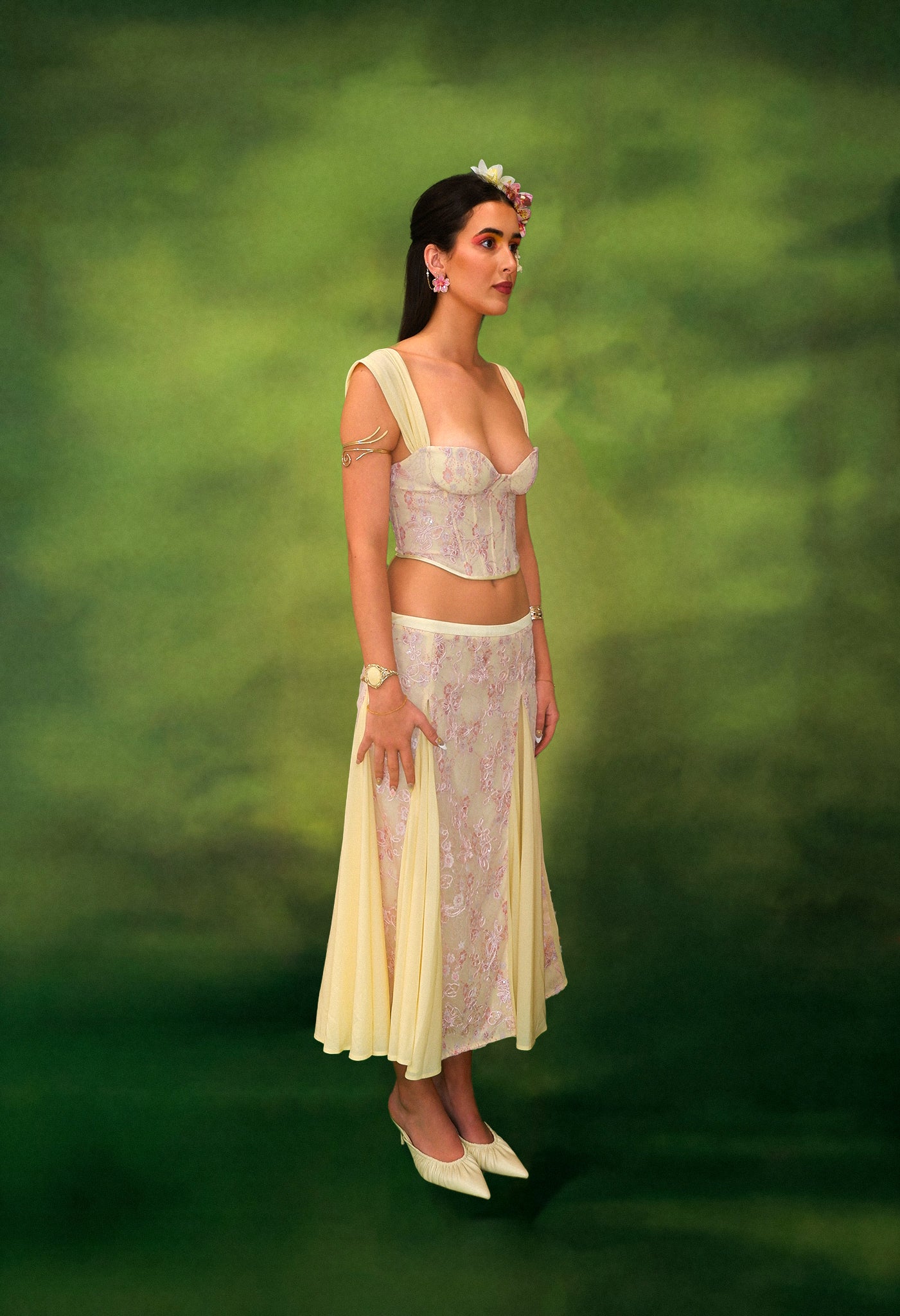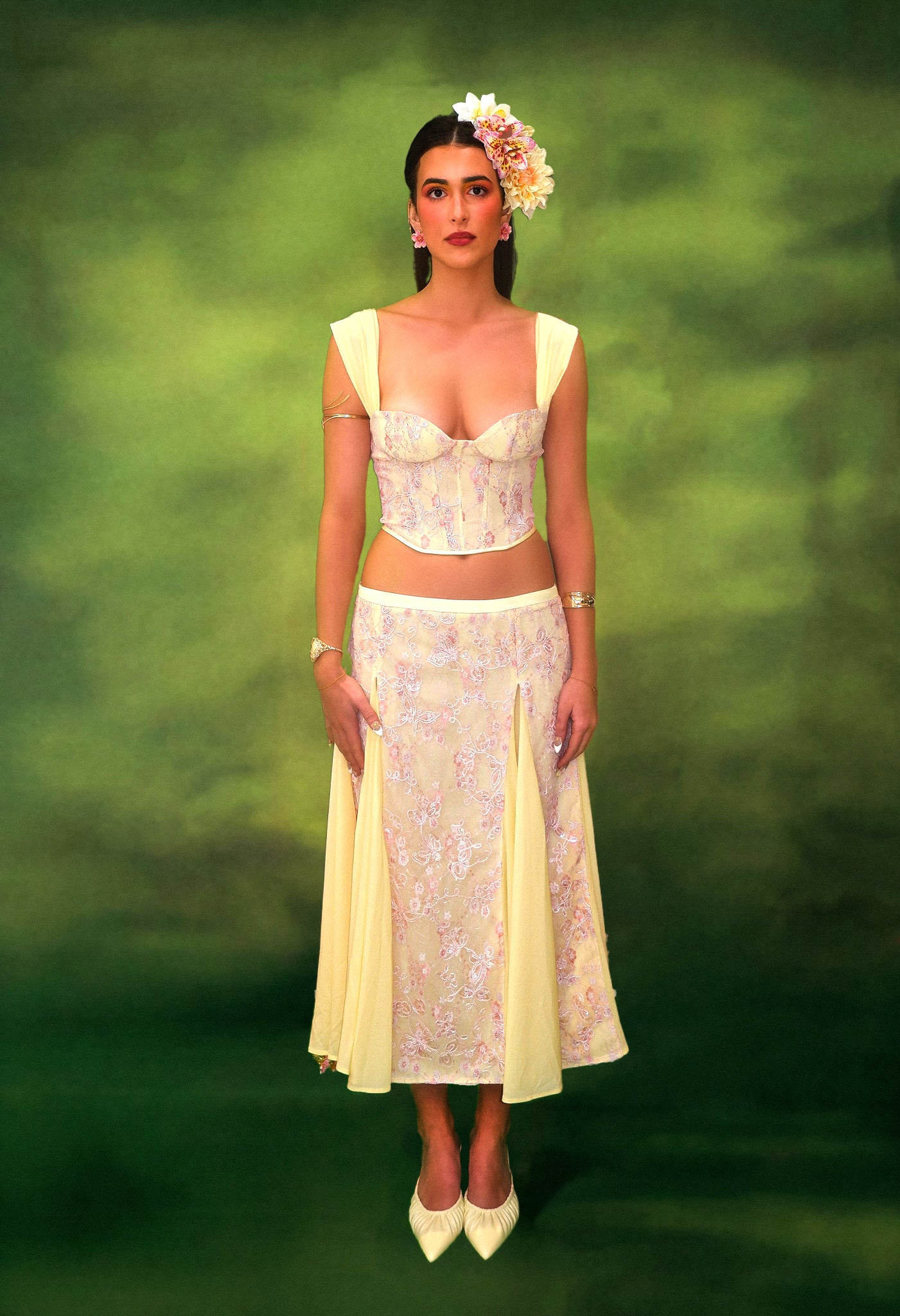 Radiant and romantic, the Fiorella Corset Top embraces the body with sculpted femininity. Crafted with a delicate butter yellow embroidered with shimmering pastel florals, it features structured boning, a flattering curved neckline, and softly draped shoulder panels that fall with effortless grace. Designed to celebrate form and beauty, this piece pairs perfectly with the matching Fiorella Skirt for a luminous, garden-inspired ensemble.