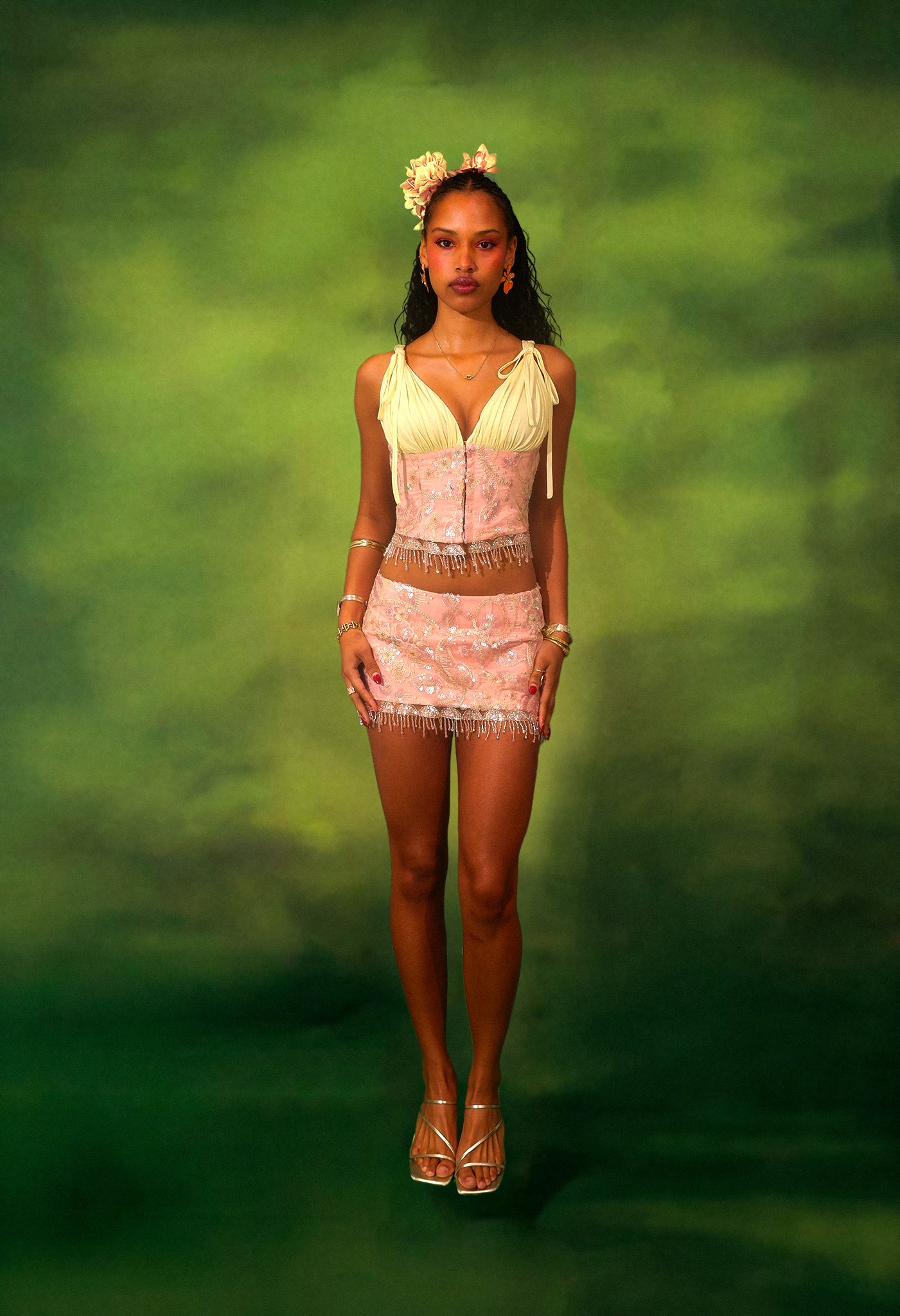 The Iris Top glows in a pink and blue. Featuring soft gathered chiffon that ties at the shoulders and a structured embroidered base adorned with delicate florals and crystal beading, this piece captures the essence of golden-hour femininity. Pair with the Iris Mini Skirt for a fun vibrant look.