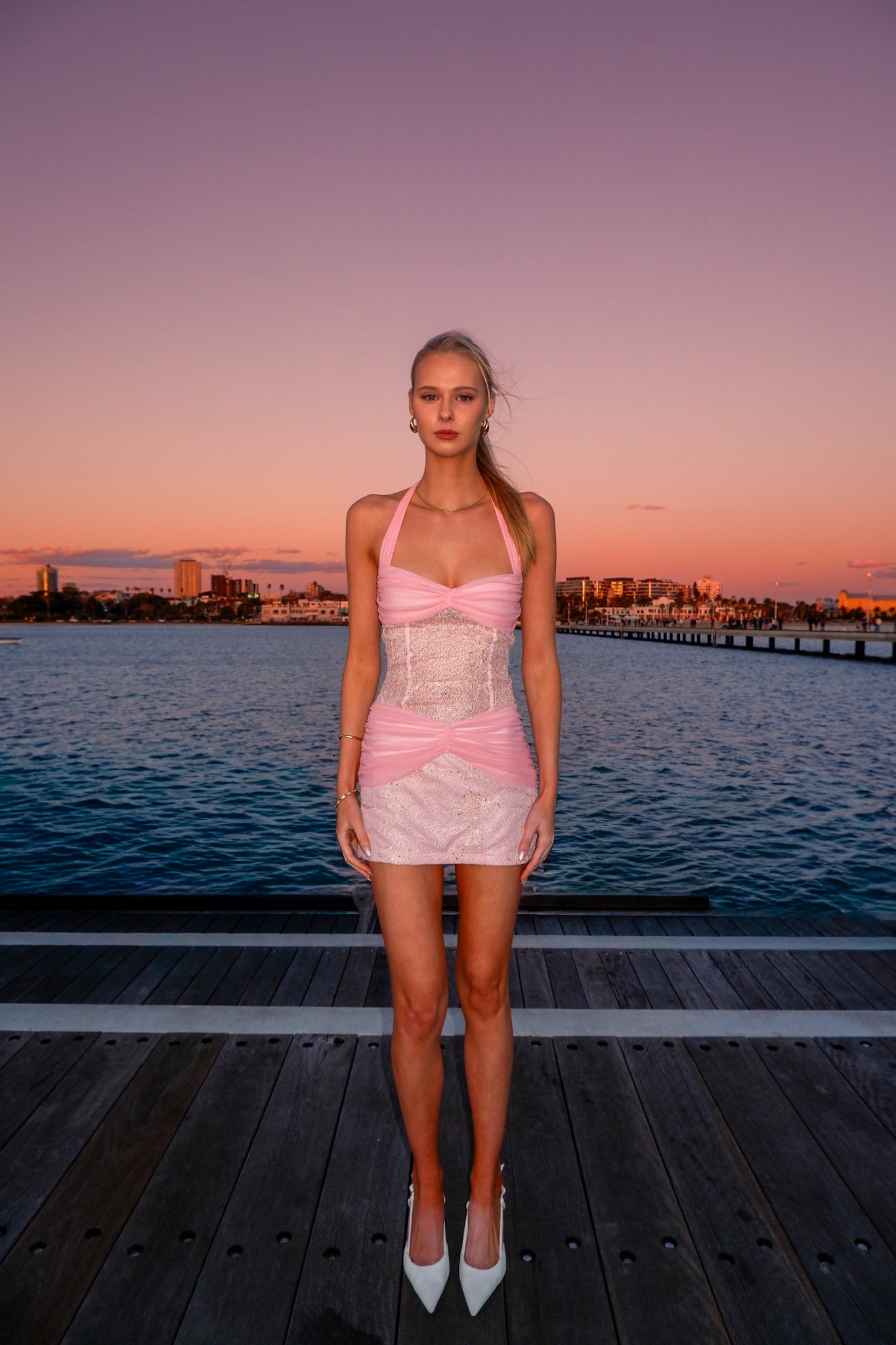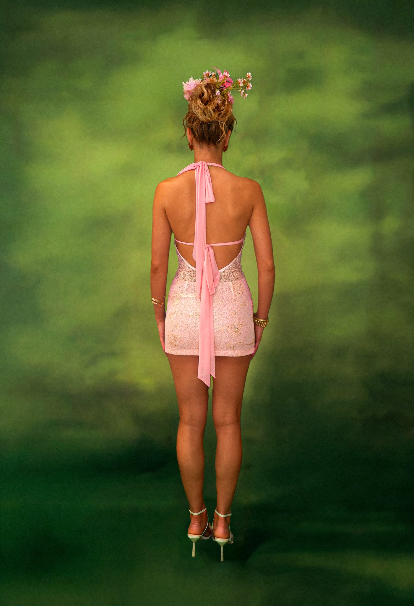 Ethereal and alluring, the Leilani Mini Dress captures the essence of soft romance. Crafted in delicate blush mesh layered over shimmering lace, it features a ruched halter neckline, contoured bodice, and a figure-hugging silhouette that glows with subtle iridescence. Graceful yet flirtatious, this piece is designed to enchant from golden hour to night.