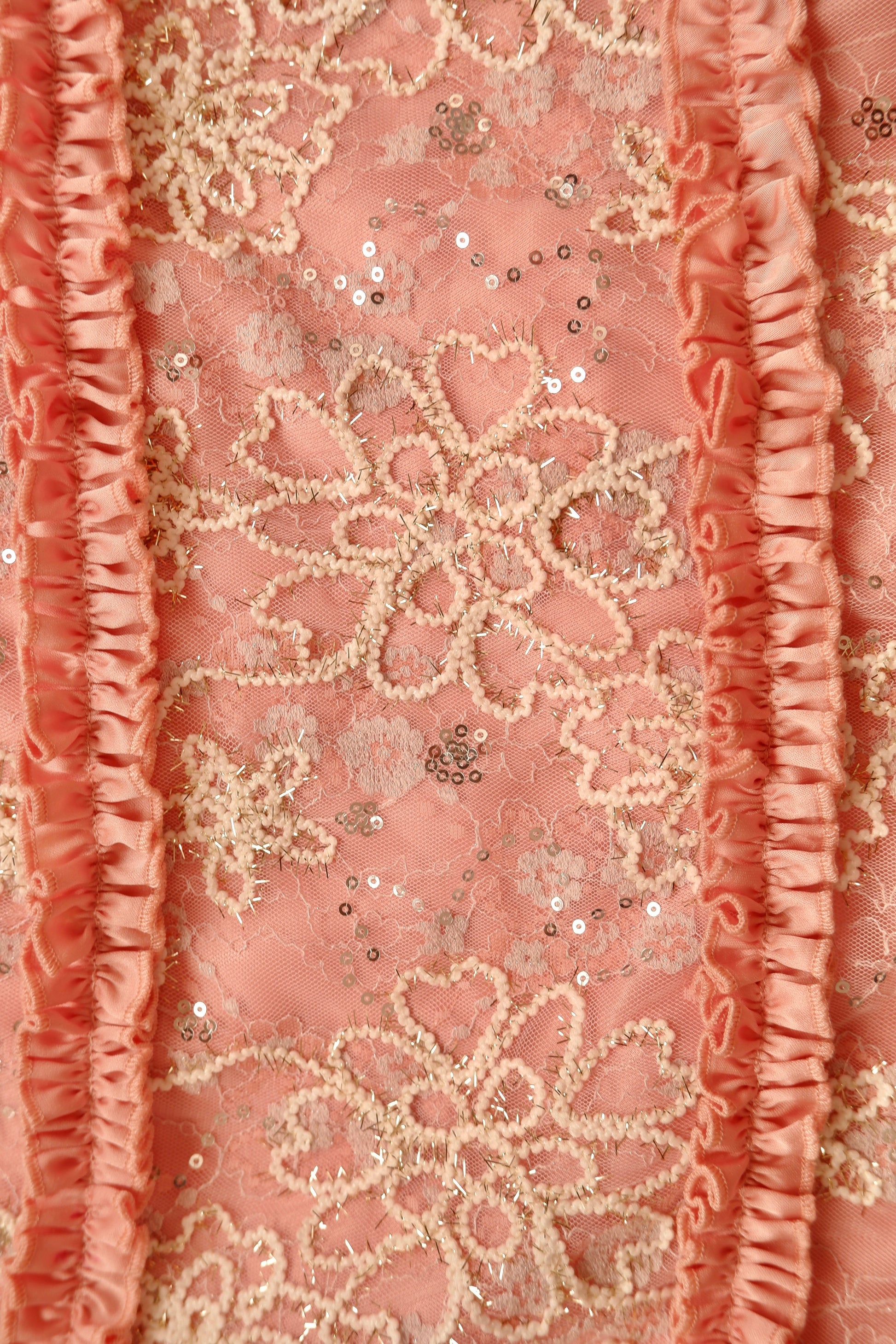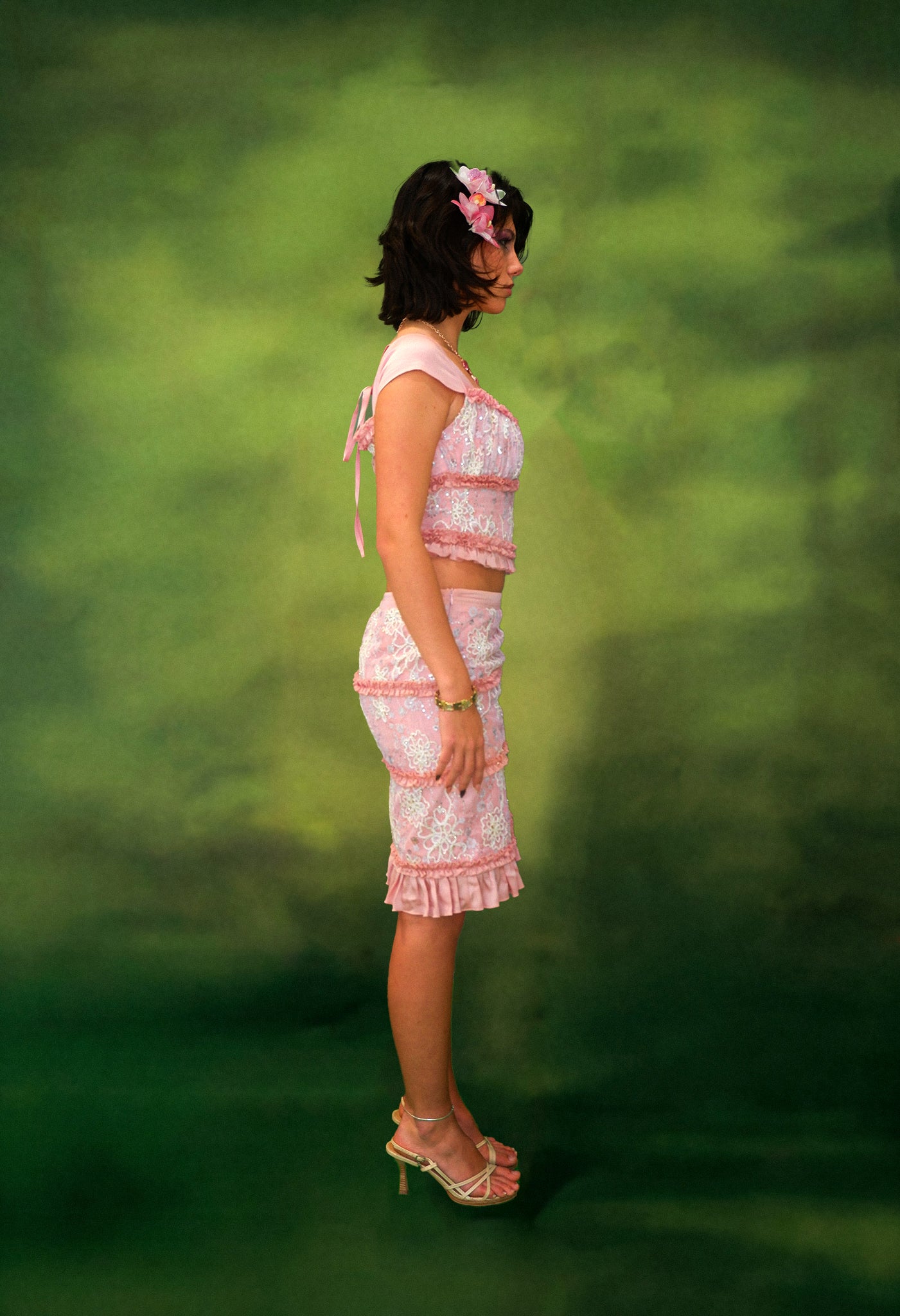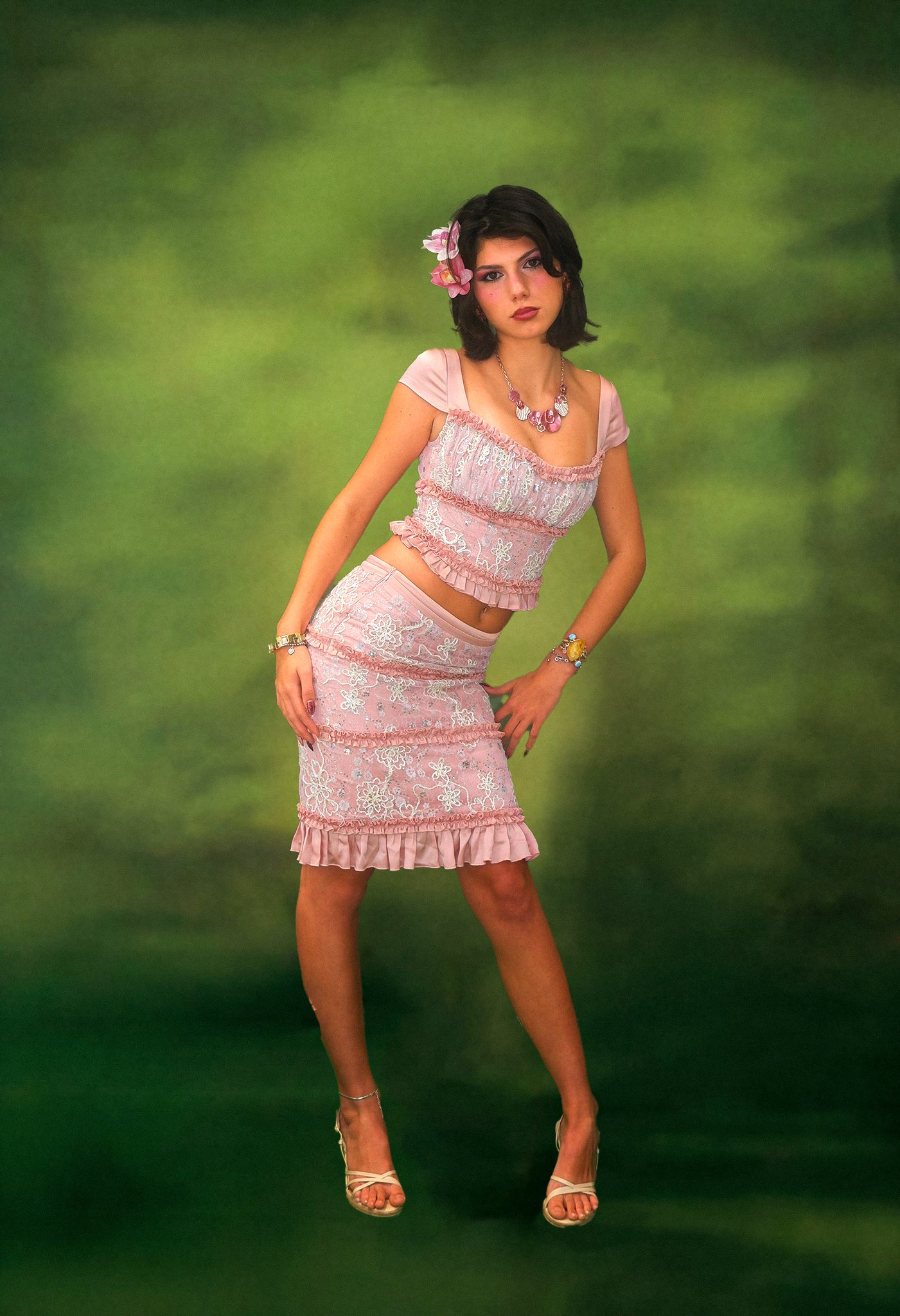 Softly sculpted and endlessly romantic, the Zahara Skirt is adorned with embroidered lace panels and fluttering satin ruffles that trace each curve. Its mid-length silhouette offers a look that feels both vintage and modern, light and grounded.